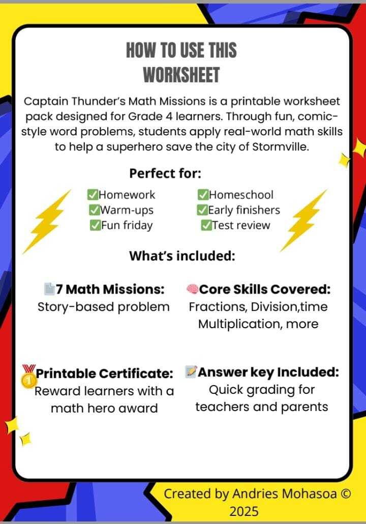 This Grade 4 printable worksheet pack includes 7 superhero-themed word problems tied to a fun, comic-style story.
